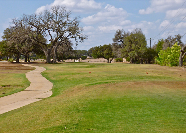 Our ongoing drought has made me think a lot more about how course conditions affect my enjoyment of the game. My home course is doing a good job of balancing fighting the effects of the drought with reasonable water conservation, but the extremely dry conditions are taking their toll. The fairways, greens, and tee boxes are in good shape, but the rough has become dry grass and bare dirt in many areas. The picture below shows a view down a fairway from the tee box, and you can see that the tee and fairway is green, but off to the other side of the cart path is bare dirt. That used to be bermuda grass. The fairway is also typically much greener than it is now, but it is healthy when in the light green color in the photo.