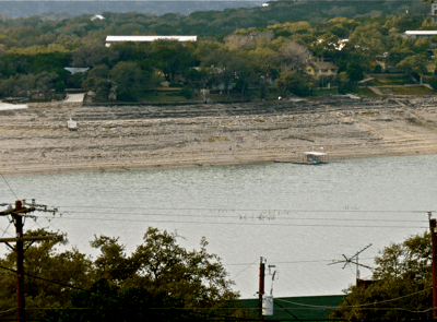 Our drought here in the Texas Hill Country has set records. The lake near my home was 53 feet below normal as of yesterday, and water restrictions have affected agriculture, lawns, and golf courses. The picture below shows what the lake looks like now. The water line is usually up where the vegetation begins, and that flat wooden thing on the slope on the left is someone’s dock. It’s usually floating in the lake.